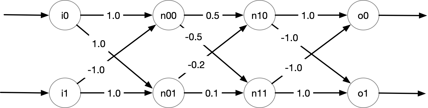 In this DNN, the outputs of the neurons in the hidden layers (prefixed with n) are applied with the relu activation function, but the outputs of the DNN (prefixed with o) are not. These settings are controlled by the True, False parameters as shown above. Also, this example does not use bias, i.e., bias values are all 0.0's as shown. Note that all of these settings are parameterized and I deliberately use this example to show these how these parameters are used (e.g., relu only applies to hidden neurons, but not outputs).